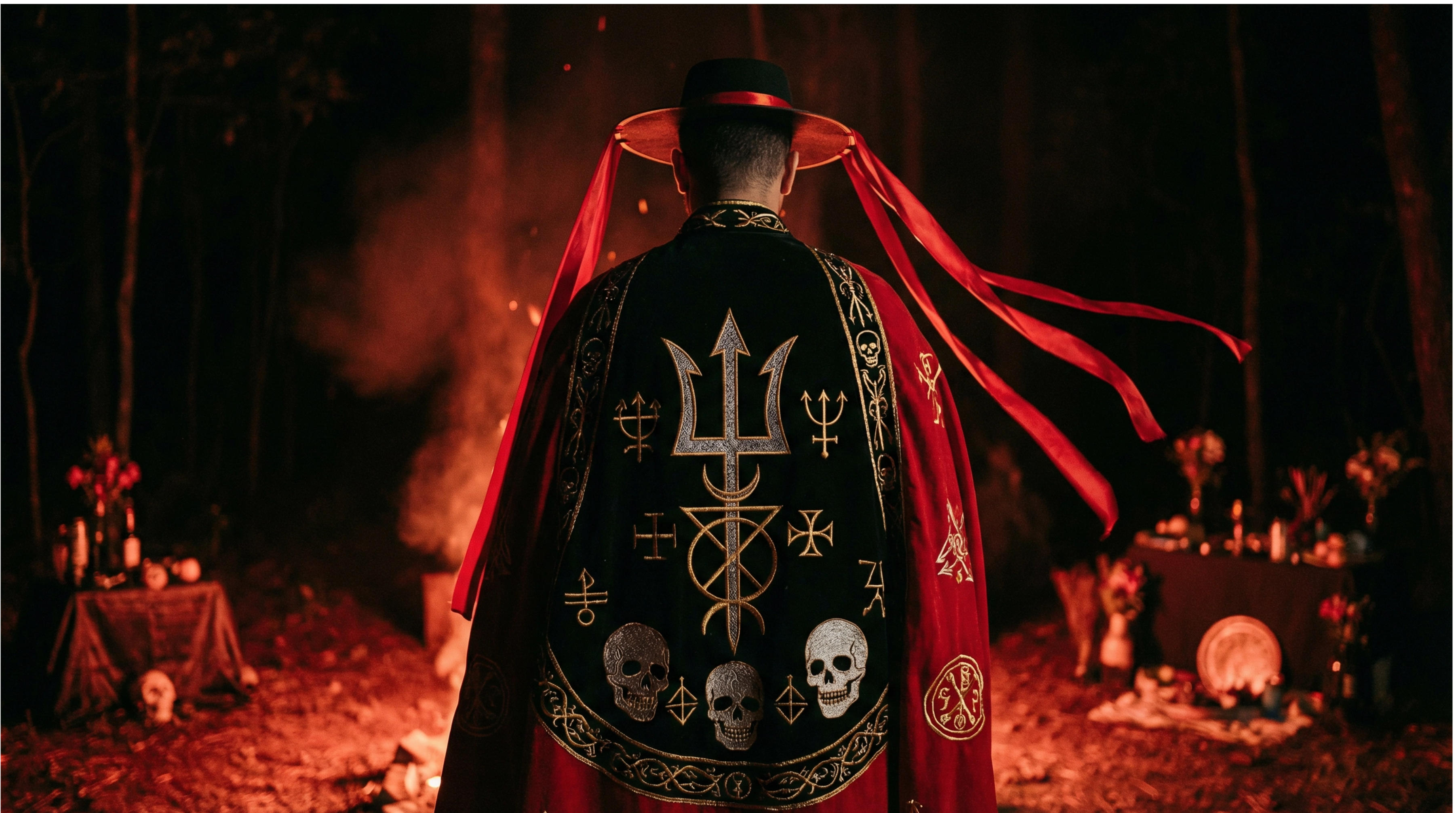 Os iniciados costumam usar roupas escuras — sobretudo preto e/ou vermelho — simbolizando o respeito ao mundo das sombras e à proteção contra influências negativas. O chapéu ou turbante, frequentemente adornado com fitas vermelhas, símbolos, penas, indica autoridade e serve como canal energético durante os rituais. As capas ou mantos, bordados com símbolos como a cruz invertida, tridente ou pontos riscados reforçam a identidade do dirigente e marcam a transmissão de saberes ancestrais. Cada detalhe, da escolha do tecido ao posicionamento dos acessórios, tem significado ritualístico, ajudando a criar um ambiente sagrado onde a energia dos guias pode fluir livremente.